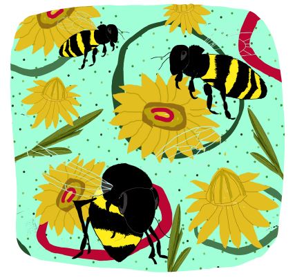 - Our wonderful bees with transparent wings on strawflowers; taking inspiration from the Noosa National Park’s Strawflowers, which are a vibrant yellow. There will be a background of blues in line with the colours of the ocean, plus sandy coloured accents and leaves.